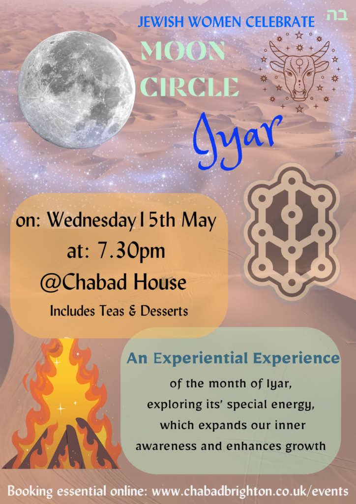 An Experiential Experience of the month of lyar, exploring its’ special energy, which expands our inner awareness and enhances growth on Wednesday 15th May at: 7.30pm. Chabad House. Includes Teas